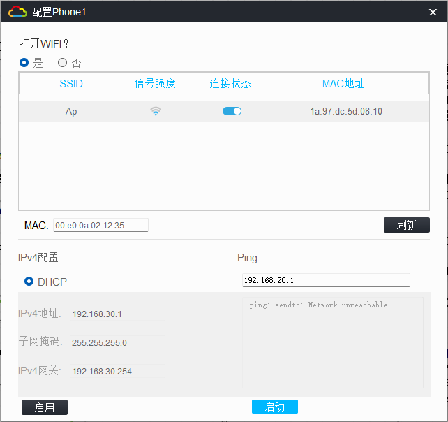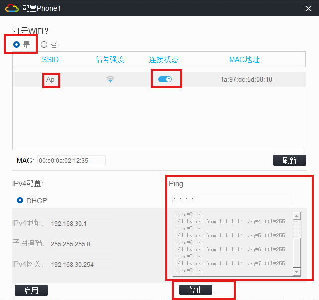无线终端成功获取VLAN 30地址,并可访问内网(1.1.1.1)及模拟外网(112.0.0.254)。