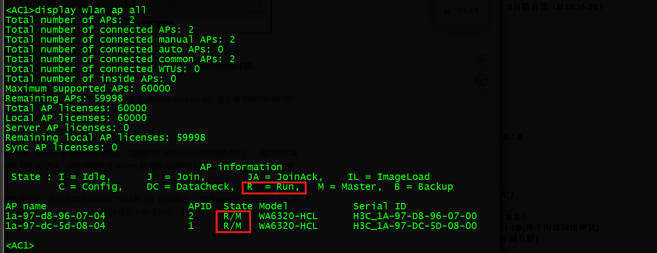 8.3.1、AP管理状态:登录AC1(AC设备),执行命令 display wlan ap all。应能看到AP1和AP2的状态为 Run,表明AP已成功通过VLAN 20注册上线。