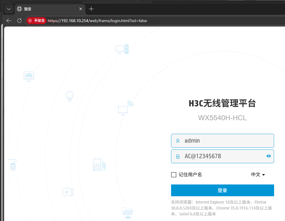 8.3.2、Web远程管理:在用于管理的Host主机上(配置192.168.10.0/24网段静态IP),通过浏览器访问 https://192.168.10.254。应能使用账号 admin 及密码 AC@12345678 成功登录AC的Web管理界面。