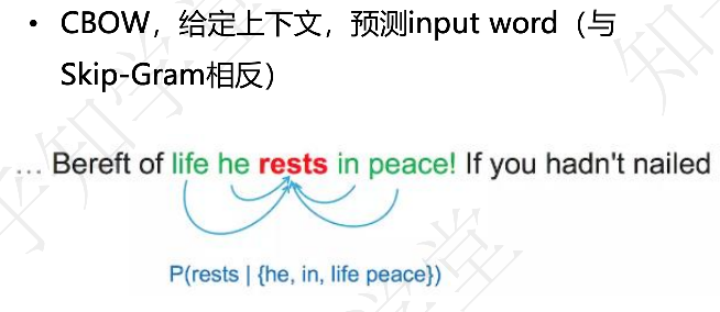 如果我们选择"rests"作为目标词,CBOW 的任务是给定上下文词(例如 "life", "he", "in", "peace"),预测中心词"rests"。通过上下文预测目标词的模型,将根据这些上下文词的向量来推测目标词的向量。