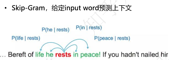 如果我们选择"rests"作为输入词(即中心词),Skip-gram 的任务是预测"rests"周围的词,比如"he","in","peace"。Skip-gram 模型会从句子中抽取出这些上下文词,并通过它们来训练模型,从而得到词的向量表示。