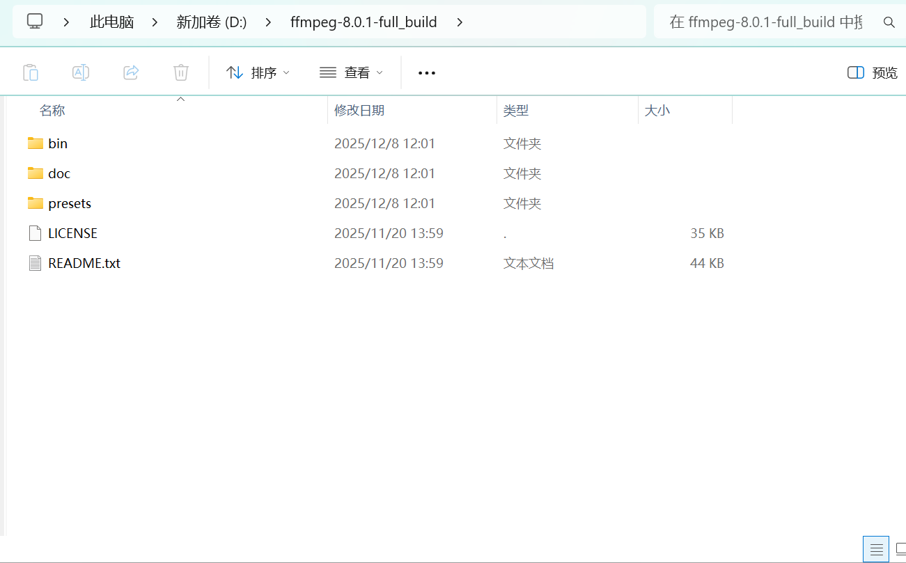 其中我们可以选择最新版本,我这里的最新版本是8.0.1,在最新版本的栏目中我们可以看到有四个压缩包。ffmpeg-release-essentials.7z 和 ffmpeg-release-essentials.zip是ffmpeg基础版的压缩包内容一样只是压缩方式不一样,ffmpeg-release-full.7z是ffmpeg完整版的压缩包,ffmpeg-release-full-shared.7z是ffmpeg完整版的动态链接压缩包,前面三个压缩包的ffmpeg均采用的是静态链接,对于静态链接就是将所有需要的库都"打包"进了 ffmpeg.exe 主程序里,使用时将 ffmpeg.exe 拷贝到文件的任何地方都可以使用,而动态链接运行时需要依赖同目录下的 .dll 文件(动态链接库),如果想要在别的开发中使用到ffmpeg最好使用动态链接的,因为可以更加灵活。下面我们就来介绍一下静态完整版ffmpeg在windows下的安装。我们点击完整版的压缩包就可以下载了,下载好后将其解压,解压好后的文件如下图: