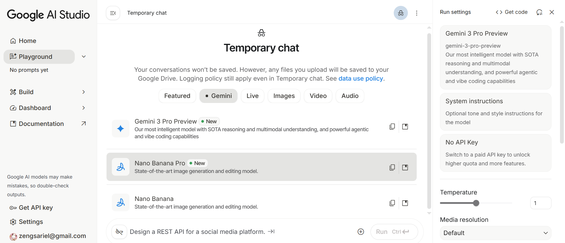 gemini总共分为模型对话,build,dashboard三个模块