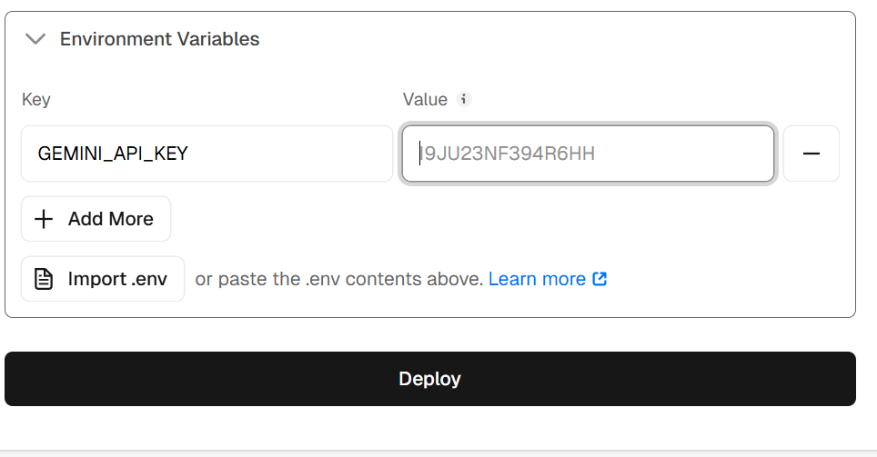 这里强制为GEMINI_API_KEY,value值随便填,这里只需要一个value占位,前端的项目也不能传输api key,因为前端代码任何看到源代码