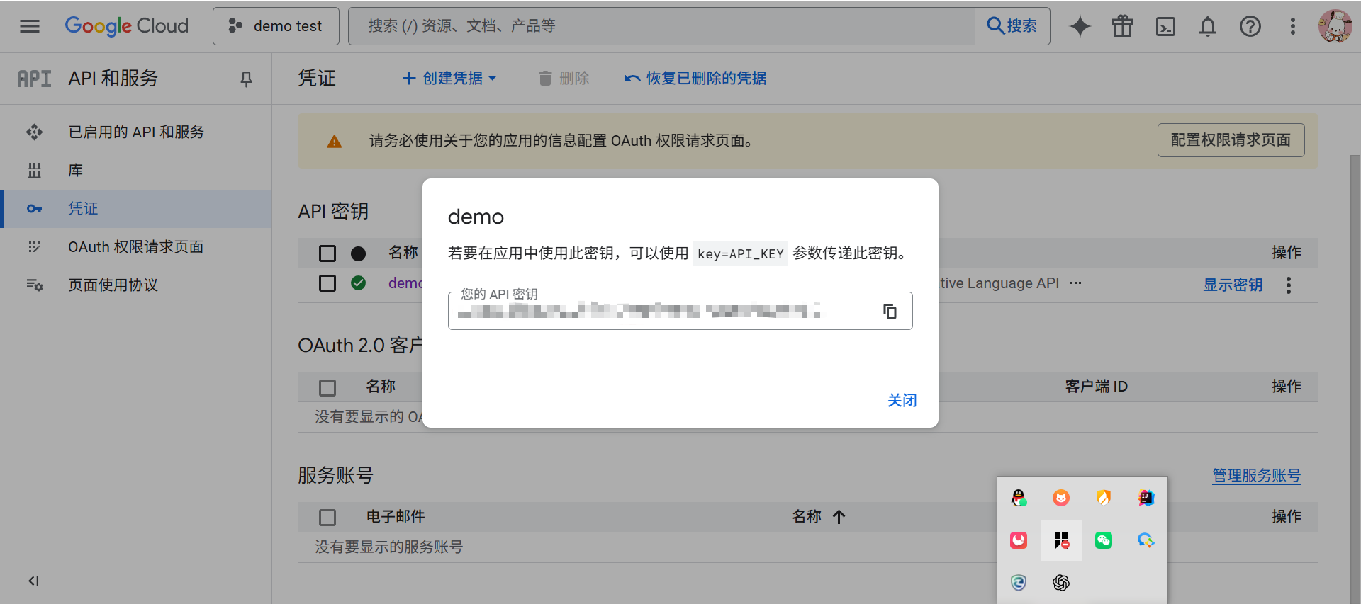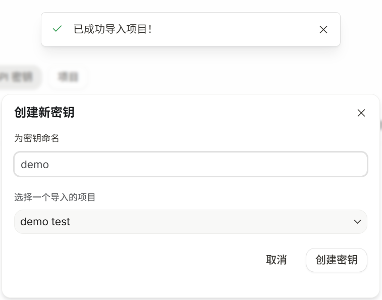 在创建api Key是导入这个原有的创建的demo test项目