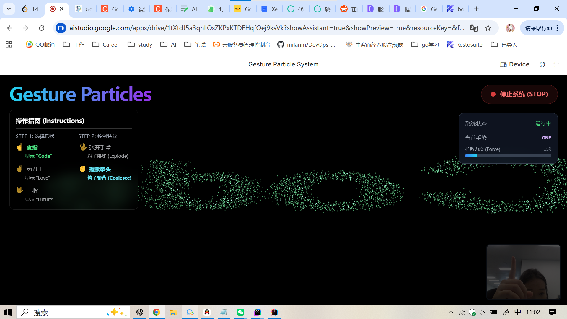 当前系统可以自动生成一个粒子系统,会自动申请当前浏览器的摄像头访问权限,并根据屏幕前的手势做出粒子响应