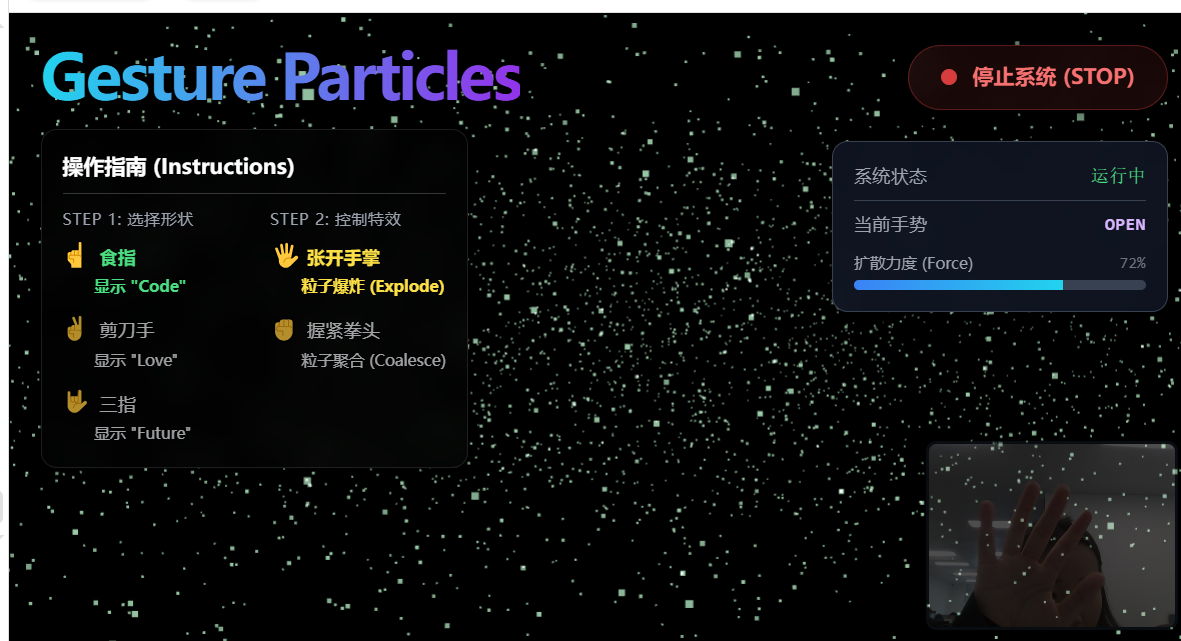 用Three.js和mediapipe创建一个实时交互的3D粒子系统。要求:1. 通过摄像头检测双手张合控制粒子群的收缩与扩散;2. 当手势为1时,粒子组成文字(),当手势为2时组成文字 () 当手势为3时,组成文字 () 3.粒子需实时响应手势变化;