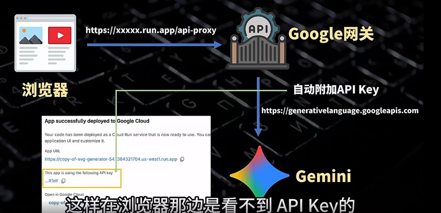 在gallery中找到名为isvg generator的样例,这个网站gemini会调用AI功能生成这个svg图片,在code中需要一个gemini api key,但是这时候笔者就想到,对于一个纯前端的项目,我们如何去保护这个api key呢?