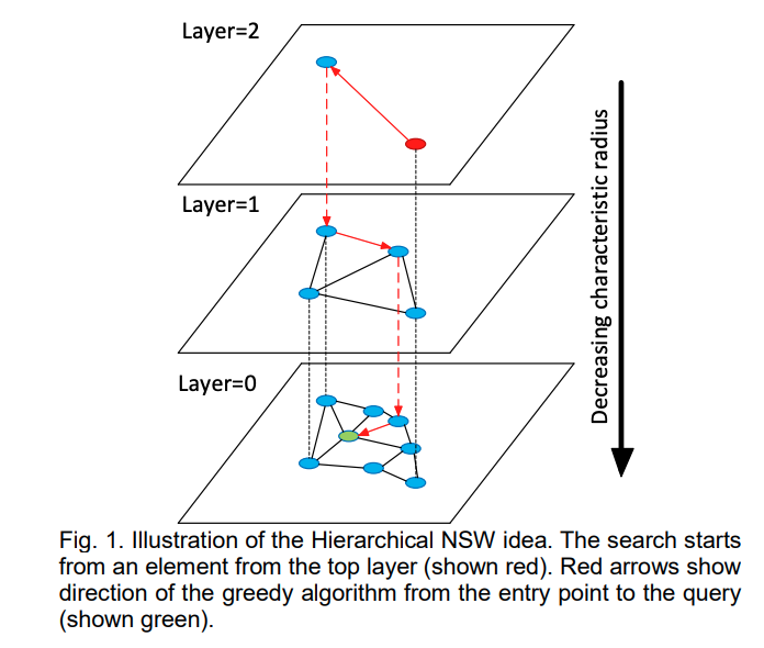 - 和 NSW 不同的是 ,在达到局部最小值后,搜索不会停止,而是转移到当前顶点在下一层的对应点,并在那里重新开始搜索