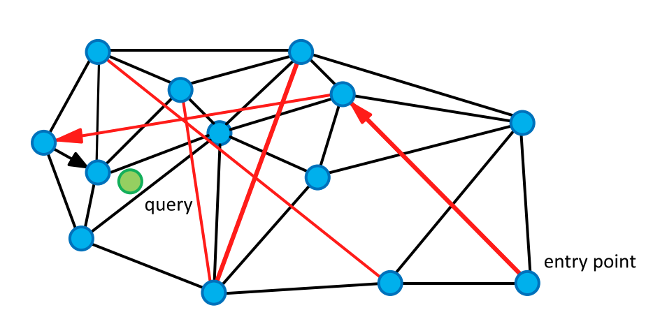 - 贪婪路由搜索: 从起点出发(entry point),在相邻节点中识别出与查询向量最为接近的一个节点,然后转移到该顶点上。重复这一过程,直到找到一个局部最小值,停止搜索