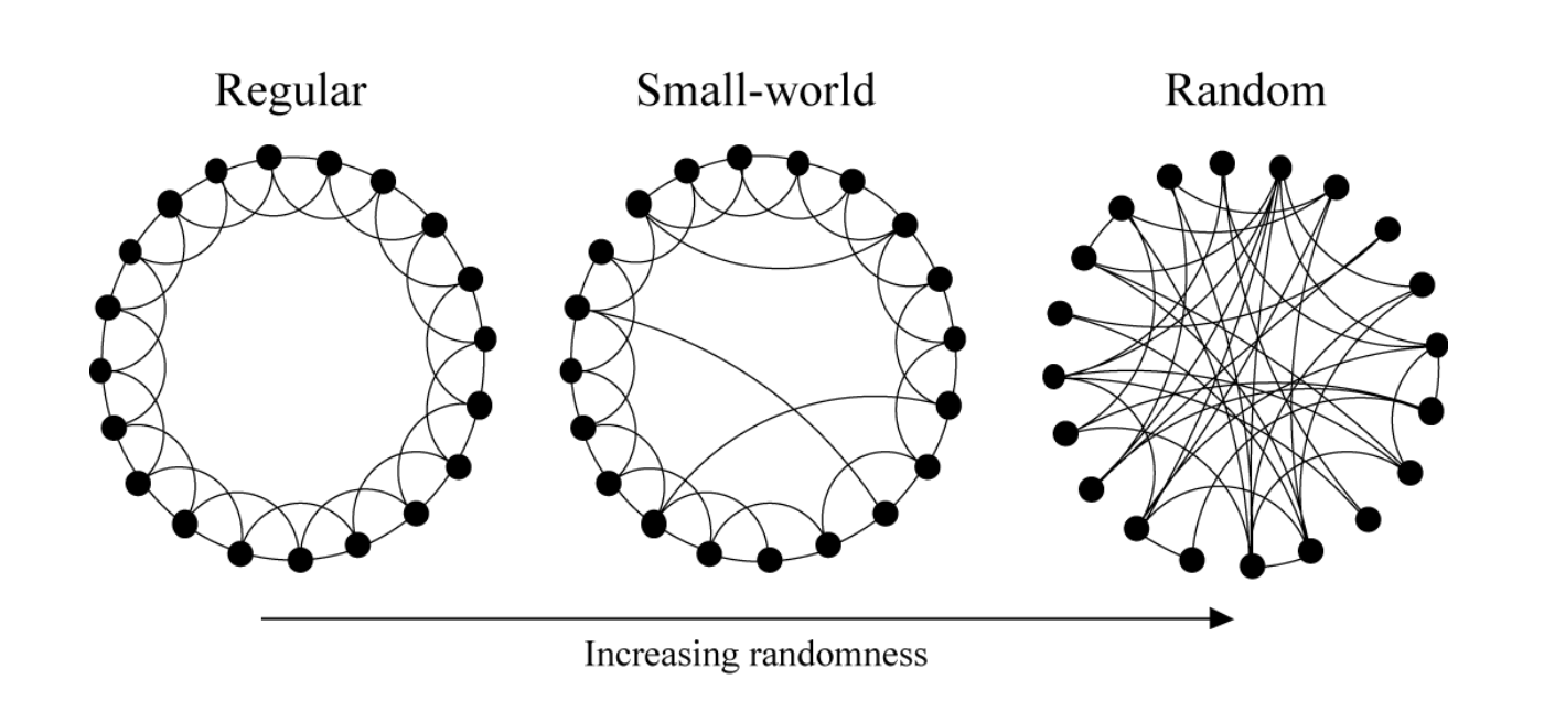 如上图所示,小世界网络介于正则图和随机图之间,小世界在局部同类节点的连接呈现出规则,但从全局来看不同类节点的连接呈现出随机性