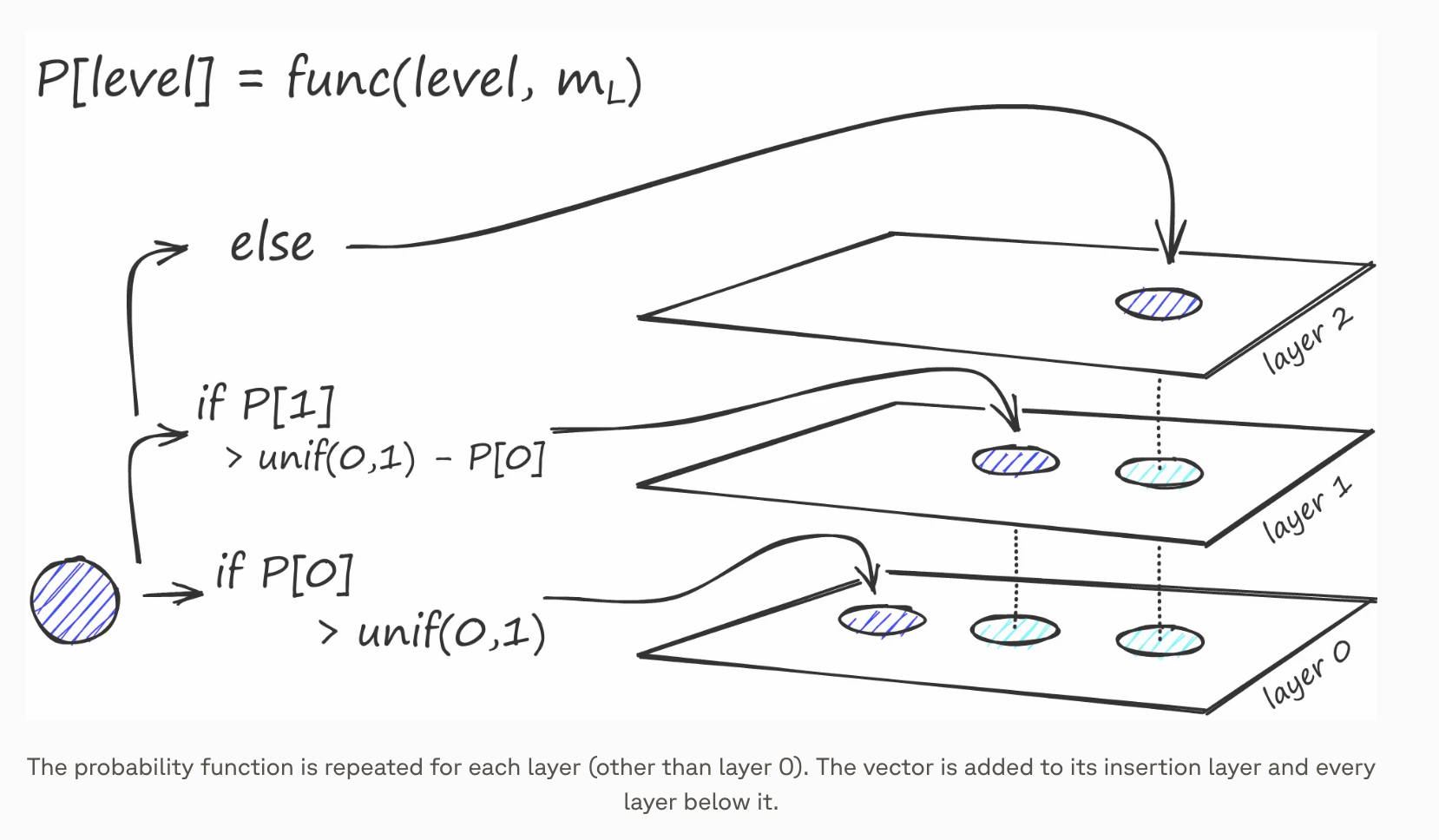 - 概率插入:每个新插入的节点,都会以一个随层高递减的概率被分配到更高的层。这确保了上层节点数较少,形成一种类似"跳表"的随机分层结构
