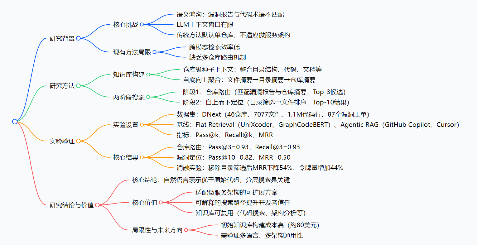 这篇论文针对多仓库微服务架构的漏洞定位难题,提出了一种"范式转换"级别的解决方案:通过将代码转化为分层自然语言摘要,把跨模态检索变成同模态推理,既发挥了LLM的语义理解优势,又解决了上下文限制和多仓库路由问题。