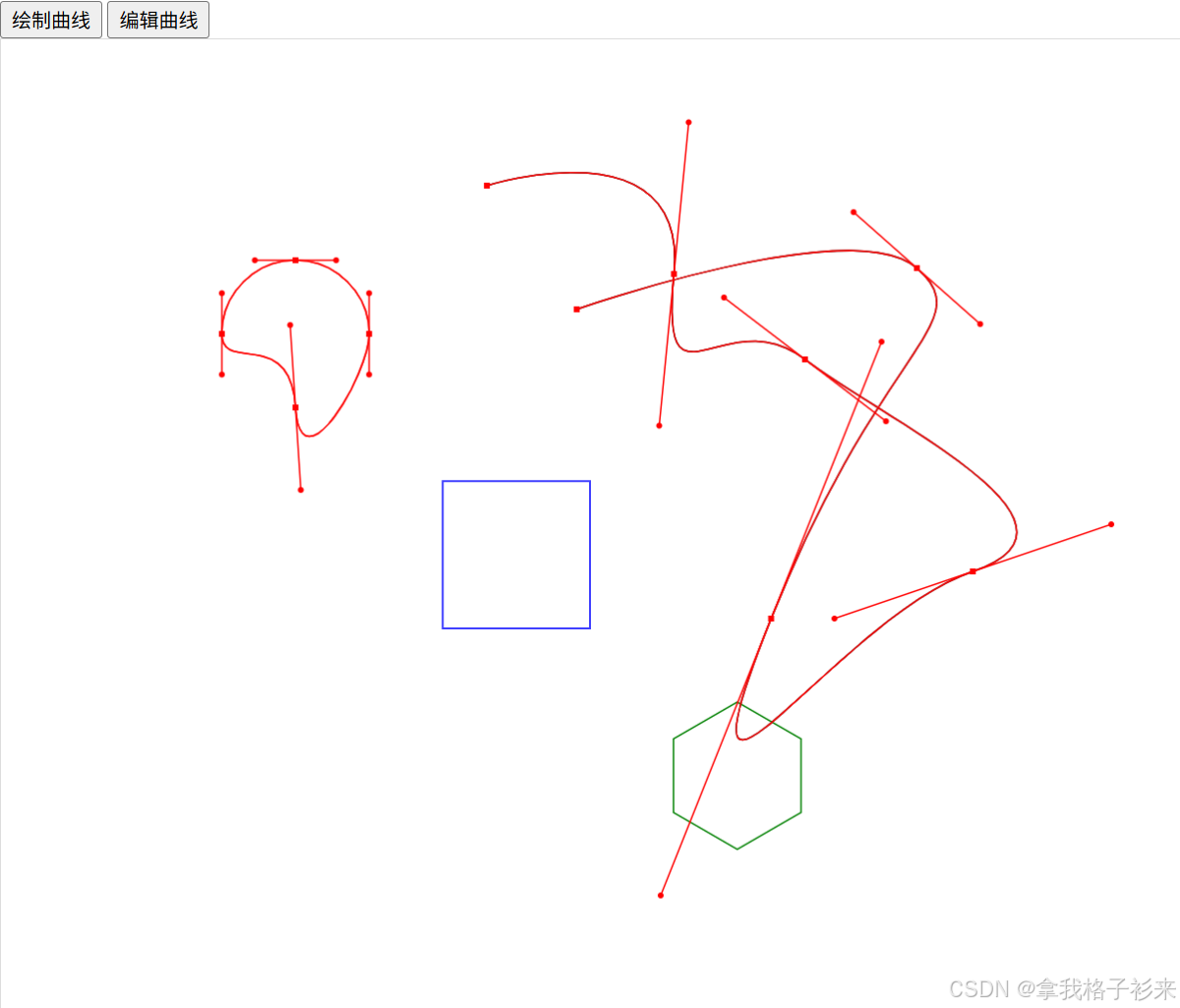 看一下实现的效果,可以使用鼠标绘制贝塞尔曲线,也可以对曲线进行二次编辑,拖拽控制点对曲线进行变形。