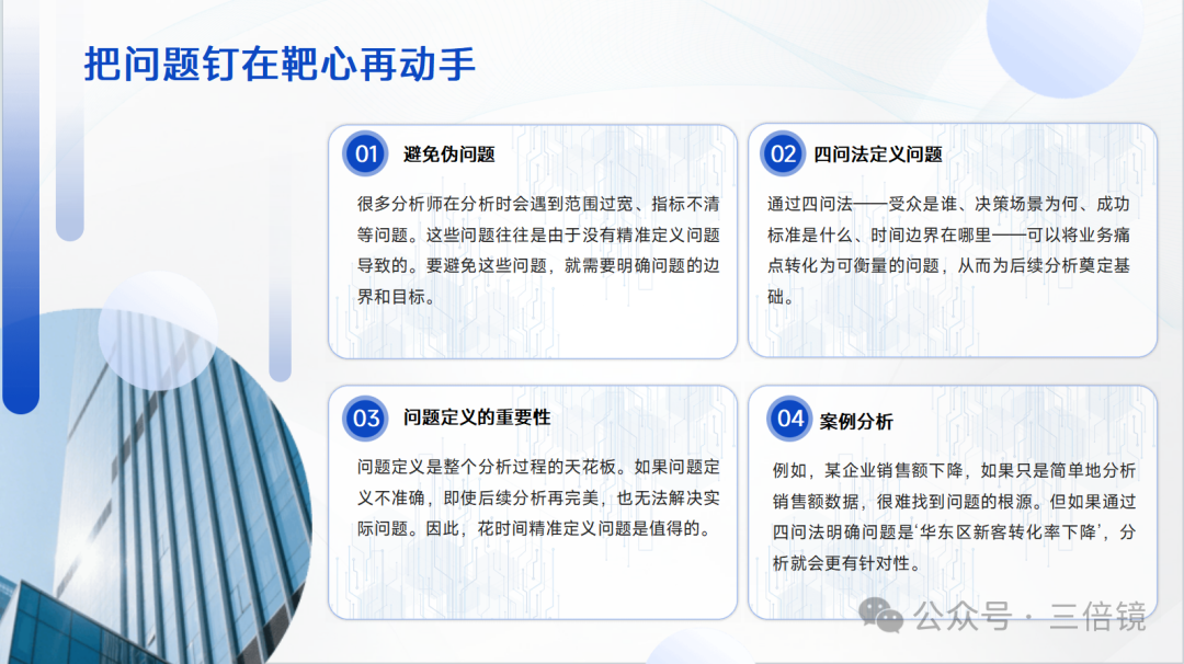 真正的高手,会花70%的时间在明确问题上:我们到底要解决什么?这个问题背后代表着什么业务需求?只有精准定义问题,才能让后续分析产生真正价值。