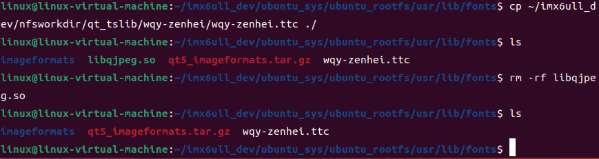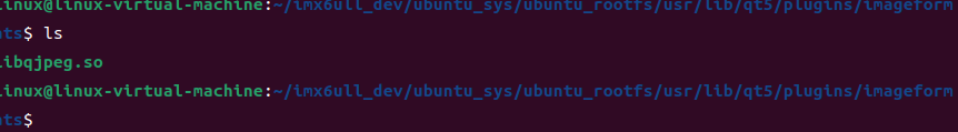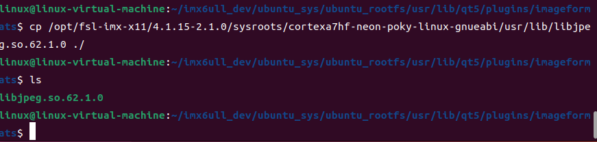 linux@linux-virtual-machine:~/imx6ull_dev/ubuntu_sys/ubuntu_rootfs/usr/lib/qt5/plugins/imageformats$ cp /opt/fsl-imx-x11/4.1.15-2.1.0/sysroots/cortexa7hf-neon-poky-linux-gnueabi/usr/lib/libjpeg.so.62.1.0 ./