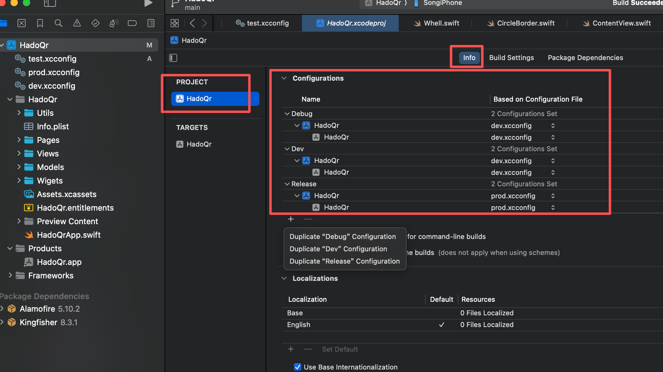 其次,将创建好的文件与项目相配置关联.在项目工程的 PROJECT => info => Configurations 层级下分别在 Debug 和 Release 模式下配置关联之前创建的 .xcconfig 文件,具体如下图所示:
