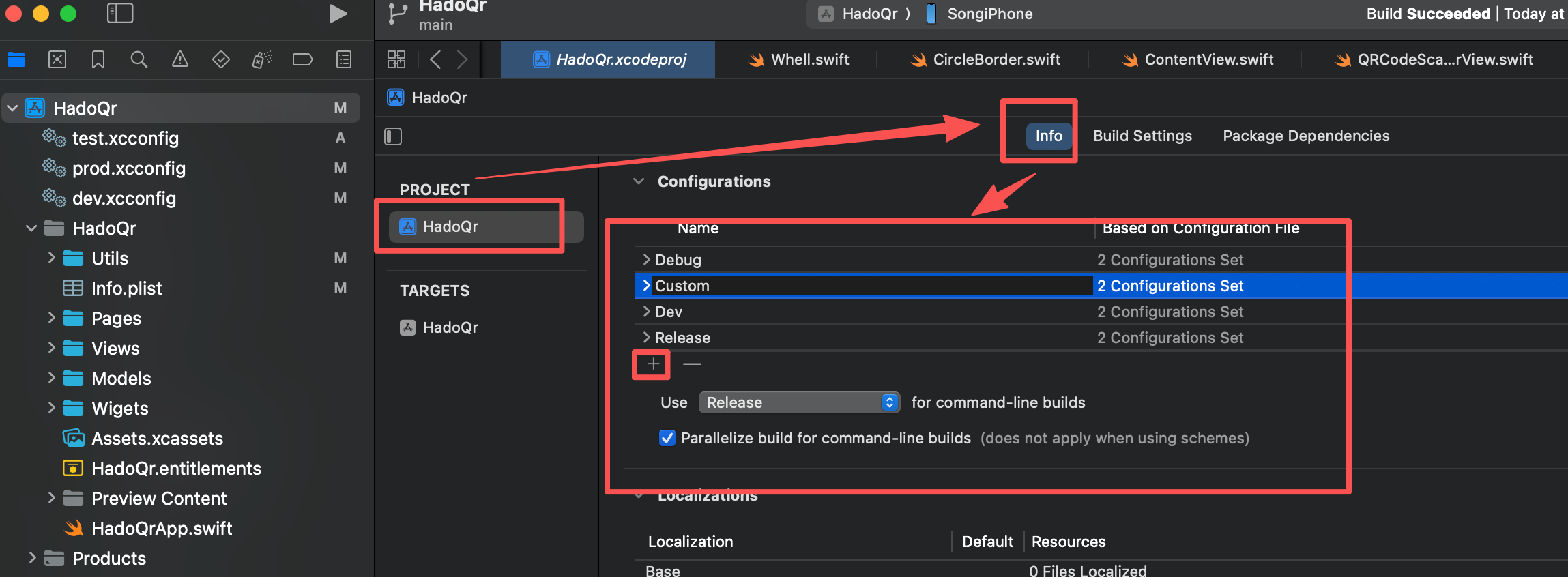 在项目下的info中,找到Configuration配置,然后下面就可以通过复制来实现更多环境配置,比如我这里是Custom,然后回车就可以编辑来关联Custom.xcconfig配置文件了