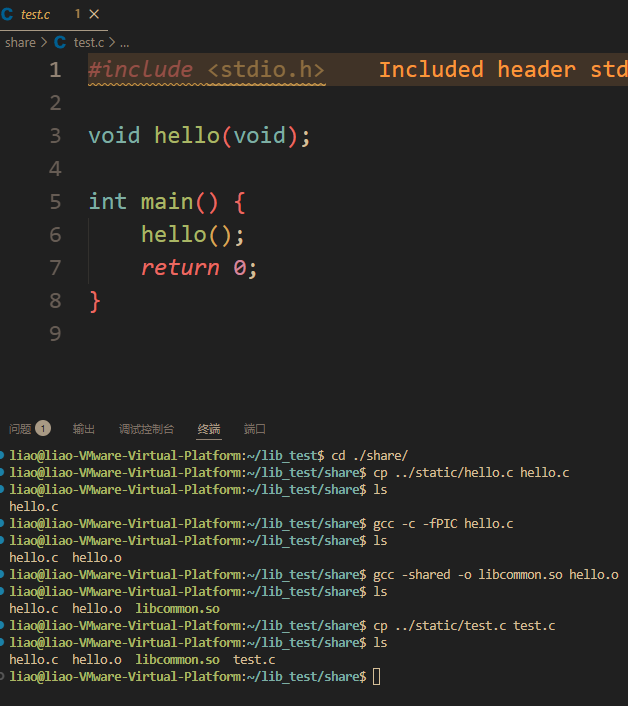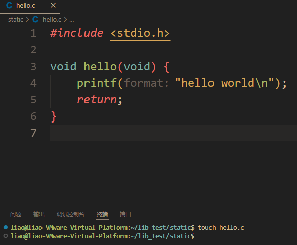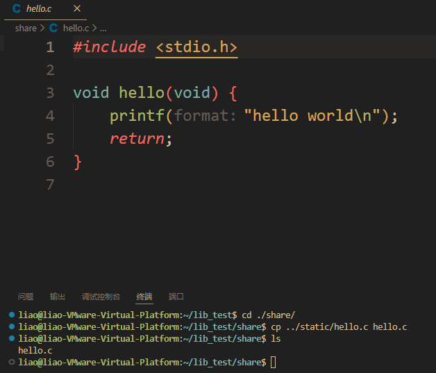 和静态库一样,动态库的创建也需要库源码,我直接将静态库的hello.c复制过来。