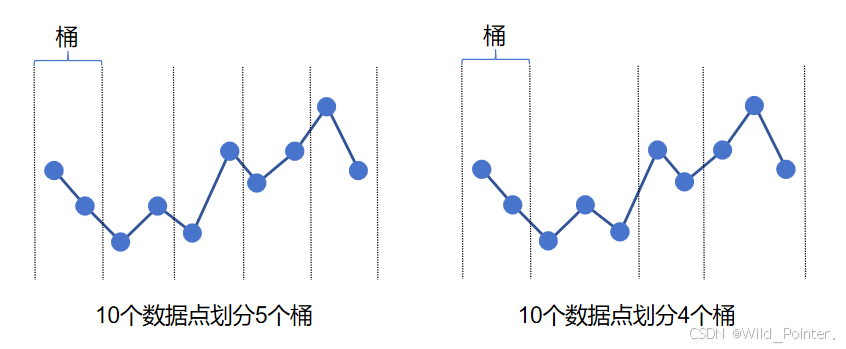 根据累计计数法,我们举个例子。假设有一个数据序列一共有10个数据点(N=10),而我们需要划分为5个桶(M=5)进行降采样,那么每一个桶的理想容量就是2(M/N),使用累计计数法进行划分的结果如下: