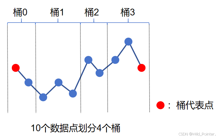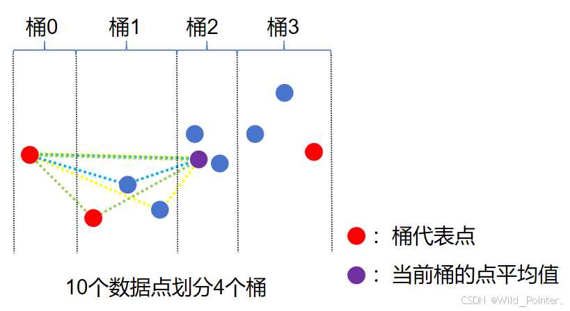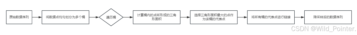 LTOB算法原理:**将时间序列数据划分为若干个大小相同的"桶",然后在每个桶内选择一个最具代表性的数据点。其选择标准基于最大三角形面积原理,即选择那个与相邻点能形成最大有效面积的点,这样的点通常位于数据变化的关键位置(如波峰、波谷),有助于保留原始序列的整体趋势和关键特征。**具体的算法流程可以参考下图: