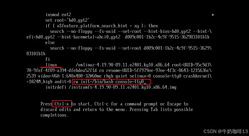 #2-在编辑界面找到以linux开头的行,在该行末尾添加参数【rw init=/bin/bash console=tty0】,添加后按下Ctrl+X启动系统,即可进入单用户模式。