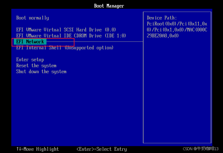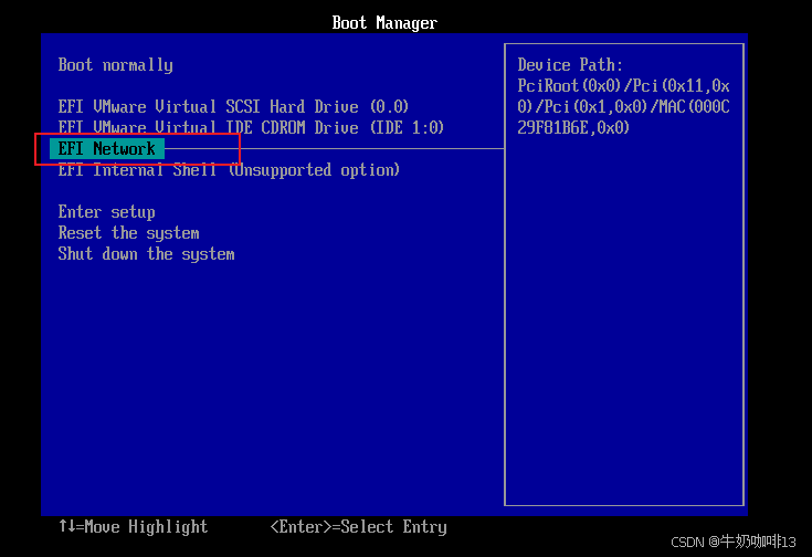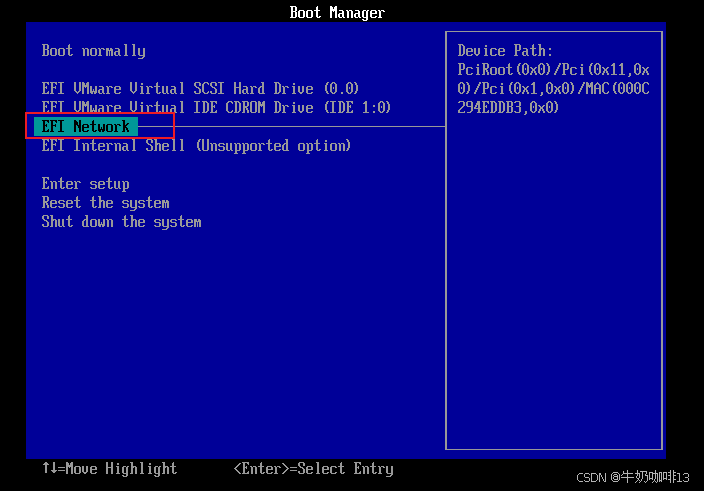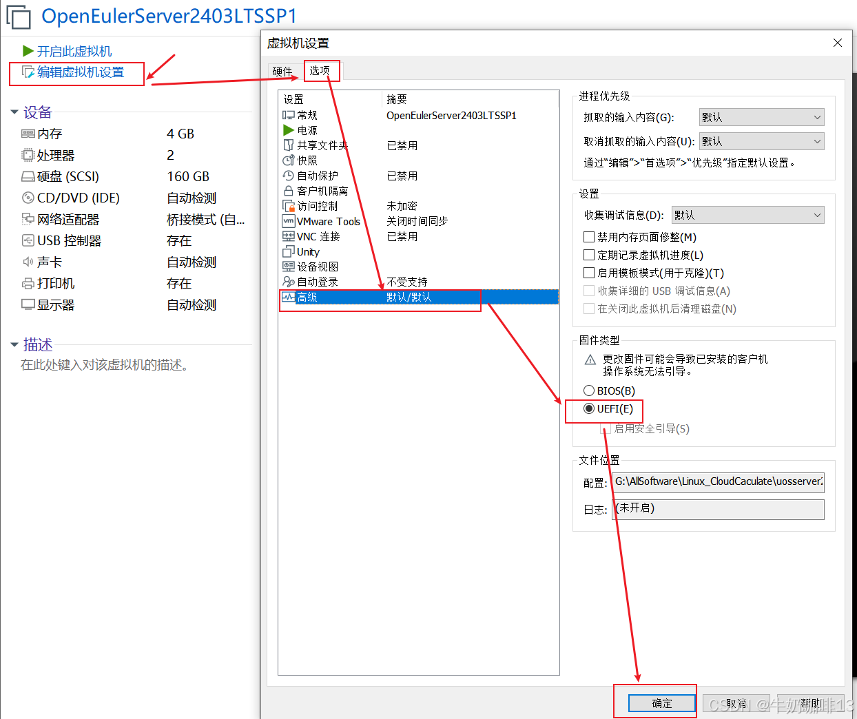 若使用虚拟机测试,则需要设置为UEFI模式,且网络模式配置为桥接模式;系统开机后按不停地F2键选择【UEFI Network】后按下Enter键进入PXE引导菜单后选择我们最下面的【Install OpenEuler 24.03 LTS SP1 @ x86-64 UEFI】后按下Enter键即可实现无人值守自动化安装,详细操作如下图所示: