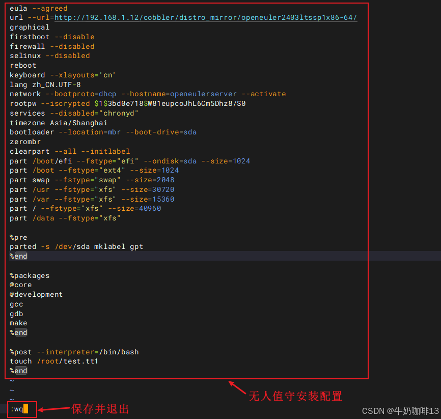 #在【/data/pxe/www/distro_mirror/openeuler2403ltssp1x86-64】下编写【openeulerserver_x86.cfg 】的自动应答文件