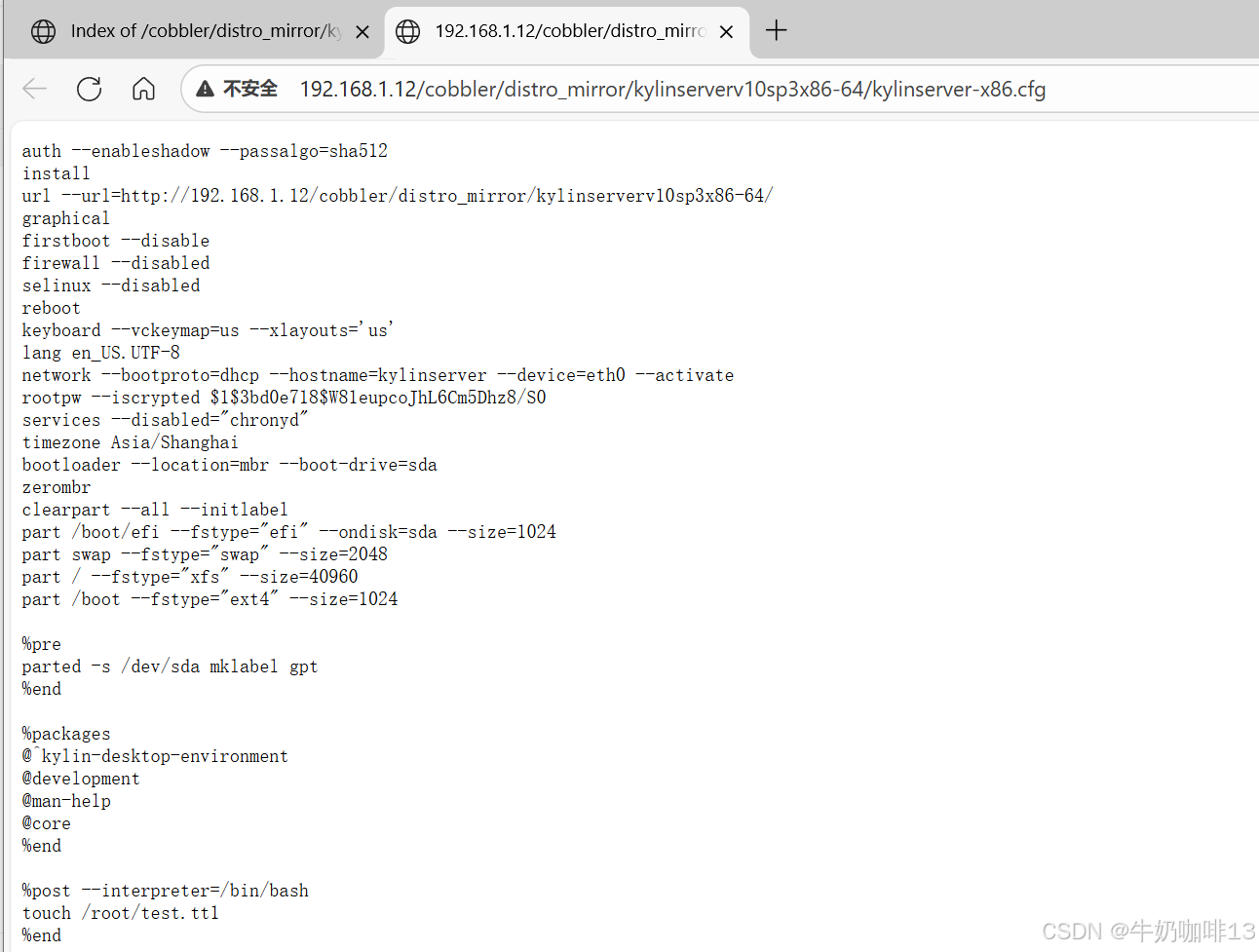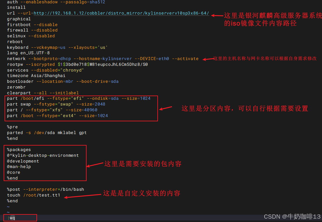 #在【/data/pxe/www/distro_mirror/kylinserverv10sp3x86-64】下编写【kylinserver-x86.cfg】的自动应答文件