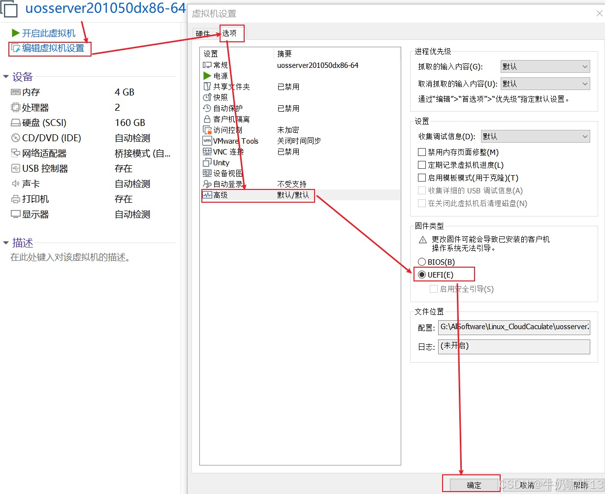 若使用虚拟机测试,则需要设置为UEFI模式,且网络模式配置为桥接模式;系统开机后按不停地F2键选择【UEFI Network】后按下Enter键进入PXE引导菜单后选择我们最下面的【Install UOS Server 1050d X86_64 UEFI】后按下Enter键即可实现无人值守自动化安装,详细操作如下图所示: