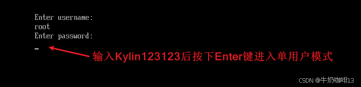 #1-重启服务器,在系统启动出现 GRUB 菜单的瞬间按下e键,此时输入 GRUB 默认账号【root】和密码【Kylin123123】,验证通过后进入编辑界面。