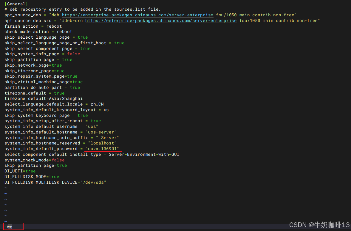 注意:【system_info_default_password】密码配置有要求(长度大于等于8位,且要求含大小写字母、数字和特殊符号【不能含有$、%】不能包含连续重复的字符或数字,不能与用户名、主机名相同或为其逆序)否则系统安装好后,使用root用户无法输入密码登录;【DI_FULLDISK_MULTIDISK_DEVICE】后的磁盘内容可通过【fdisk -l】命令获取。