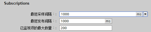 | 服务器的订阅设置: 最短采样间隔: 设置 OPC UA 服务器记录 CPU 变量值并与以前值相比较检查是否发生变更的时间间隔。 最短发布间隔: 变量值发生改变时服务器通过新值向客户端发送消息的时间间隔。 **已监视项的最大数量:**指定该 CPU 的 OPC UA 服务器可同时监视值更改的最大元素数量。监视会占用资源。可监视元素的最大数量取决于所用的 CPU。 |
