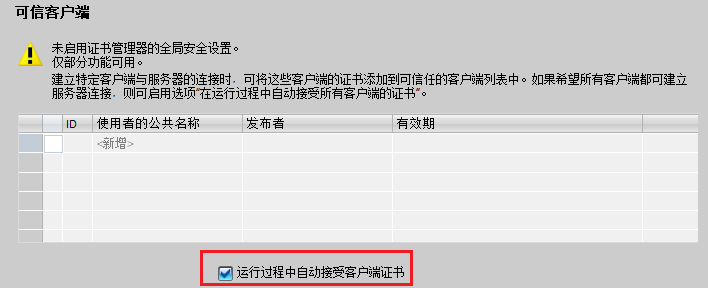 | 使用可信客户端列表,以仅允许对特定客户端进行访问。此项为可选操作,可以直接选择下载的"运行时自动接受所有客户端证书" 如果选择选项"运行时自动接受所有客户端证书"(位于"受信客户端" 列表下),则服务器会自动接受所有客户端证书。 |