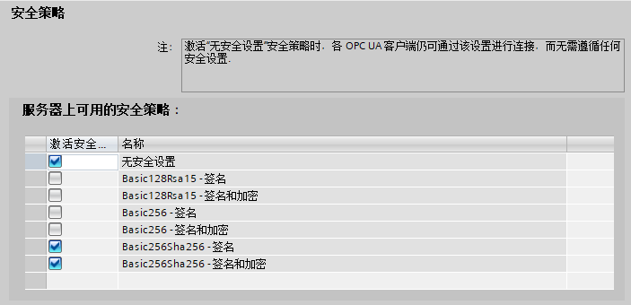 | 调试初期可以考虑使用默 认的"无安全设置",一旦调试结束,建议只选择与您的设备或工厂的安全概念兼容的安全策略,如果可能,请使用"Basic256Sha256"设置,并禁用所有其它安全策略。 |