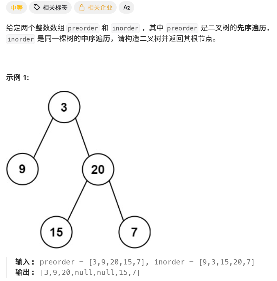 (1)子问题:preorder 第一个是根节点。从 inorder 中找到根节点位置 rootIndex,划分出左右子树节点个数大小。根据这个大小,在 preorder 中划分出左右子树范围。构建根节点,构建左、右子树,返回整棵树。