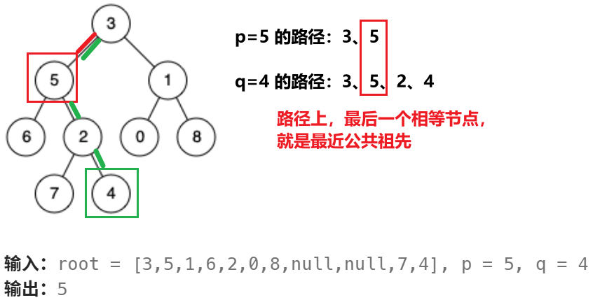 先深度遍历,找出 root 到 p、q 的路径。再对比两条路径,找出最后相等的节点。