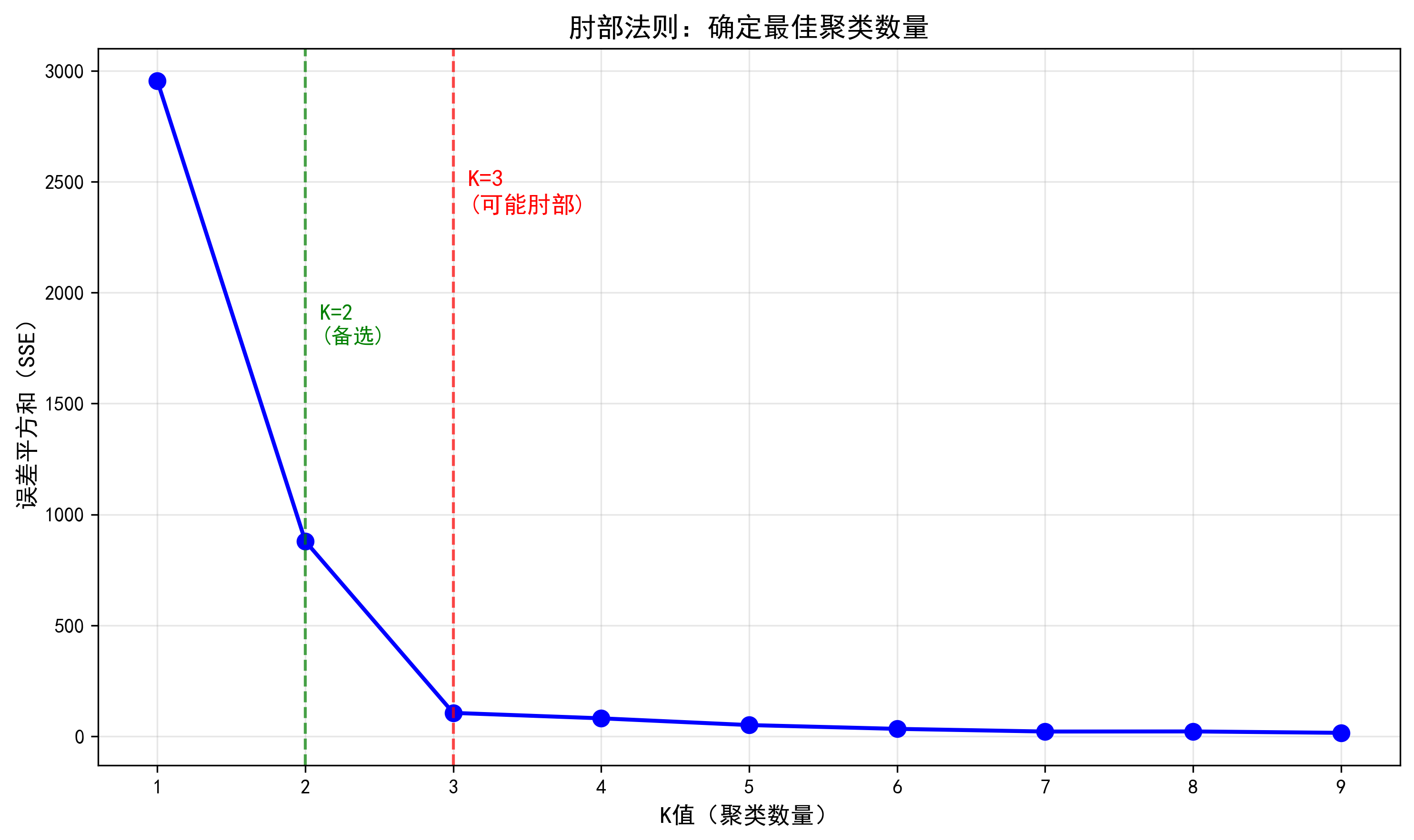 这张图运用肘部法则来验证K值选择的科学性。横轴表示不同的K值(从1到9),纵轴表示对应的误差平方和(SSE)。蓝色点线显示了SSE随K值增加而下降的趋势:当K从1增加到3时,SSE急剧下降;当K大于3后,SSE下降速度明显变缓。图中用红色虚线标出了K=3的位置,并标注为"可能肘部",表明此处是曲线的拐点,增加更多簇带来的收益显著降低。这张图为选择K=3提供了数据支持,避免了聚类数量选择的主观随意性,体现了机器学习中参数优化的科学方法。
