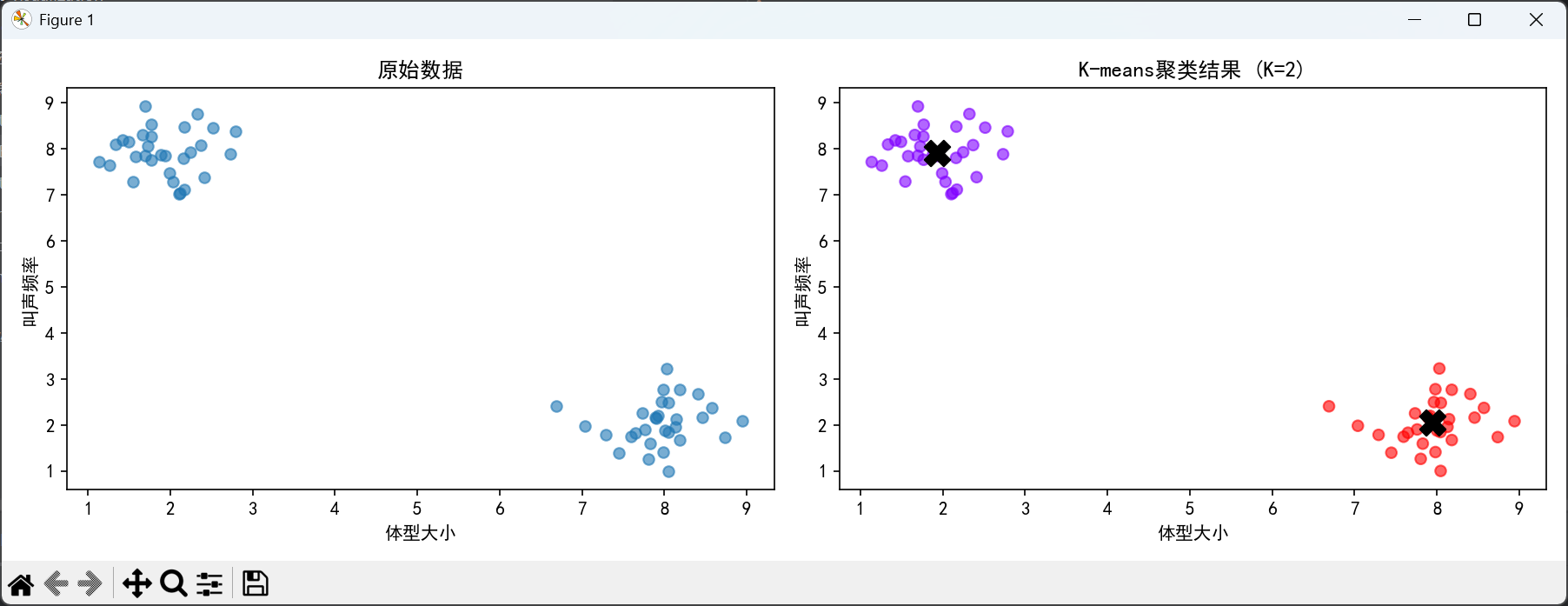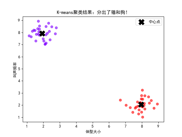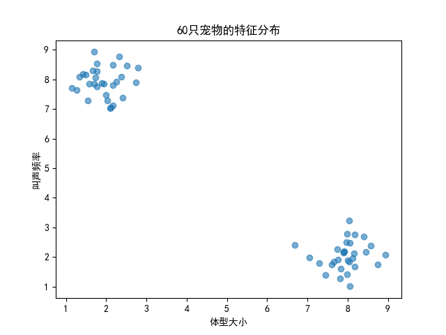 展示了60只宠物的原始特征分布,横轴表示体型大小,纵轴表示叫声频率。图中可以明显看到数据点自然分成两个区域:左上角区域(体型小、叫声频率高,代表小猫)和右下角区域(体型大、叫声频率低,代表小狗)。这张图直观呈现了数据的自然分组结构,为后续聚类分析提供了视觉基础。