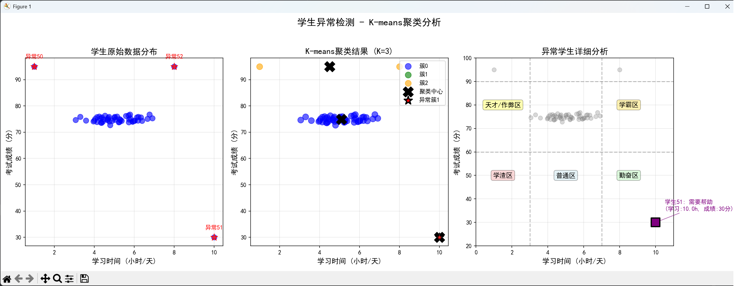 展示了K-means算法(K=3)的聚类效果。不同颜色(蓝、绿、橙)代表三个不同的簇,黑色"X"标记表示各簇的质心。值得注意的是,红色星号标记的异常学生全部被分到了橙色簇中,形成了一个独立的异常簇。该簇的质心明显偏离正常学生簇的质心,表明算法成功捕捉到了数据的异常模式。图中还清晰展示了正常学生被分为两个簇的情况,反映了学生群体中可能存在的亚群体差异。