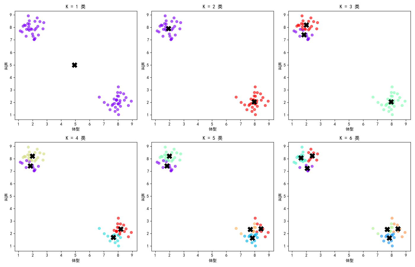 下面这段代码完整演示了K-means聚类算法的完整工作流程:首先创建了一个模拟的"猫狗数据集"(包含60个宠物样本,每个样本有体型大小和叫声频率两个特征),然后使用K-means算法将数据分为两类(K=2),最后通过"肘部法则"确定最佳聚类数量。整个过程涵盖了数据生成、算法应用、结果可视化和参数优化四个关键环节。