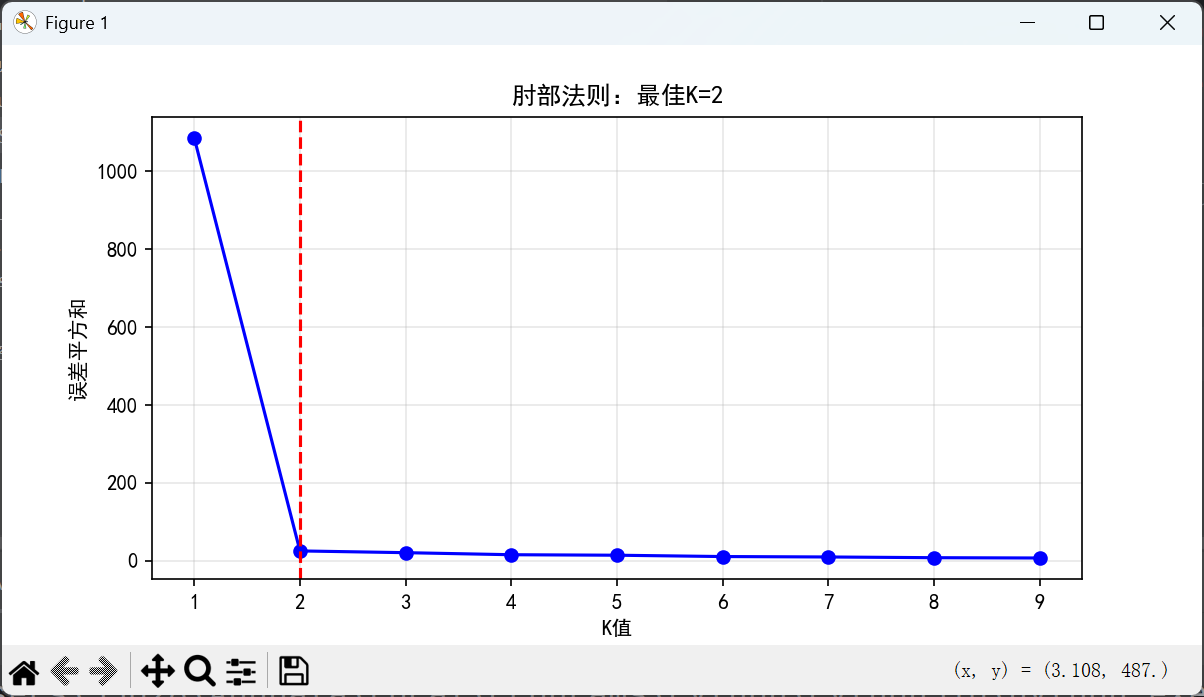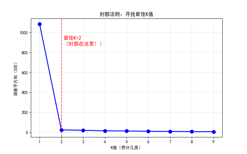 展示了"肘部法则"用于确定最佳K值的过程。横轴表示不同的K值(从1到9),纵轴表示对应的误差平方和(SSE)。图中用蓝色点线连接了每个K值对应的SSE值,红色虚线标记了K=2的位置。曲线在K=2处出现明显的拐点(形似"肘部"),之后SSE的下降趋势明显变缓,这表明K=2是最具"性价比"的聚类数量,增加更多簇的收益有限。这张图形象展示了如何科学地选择聚类数量,避免主观猜测。