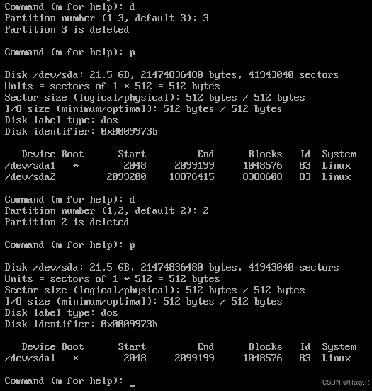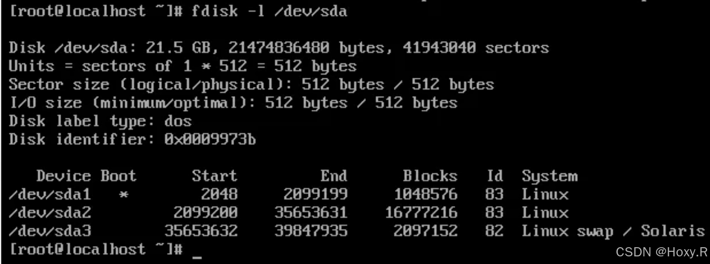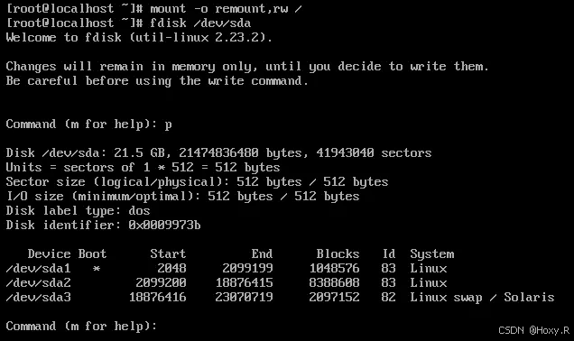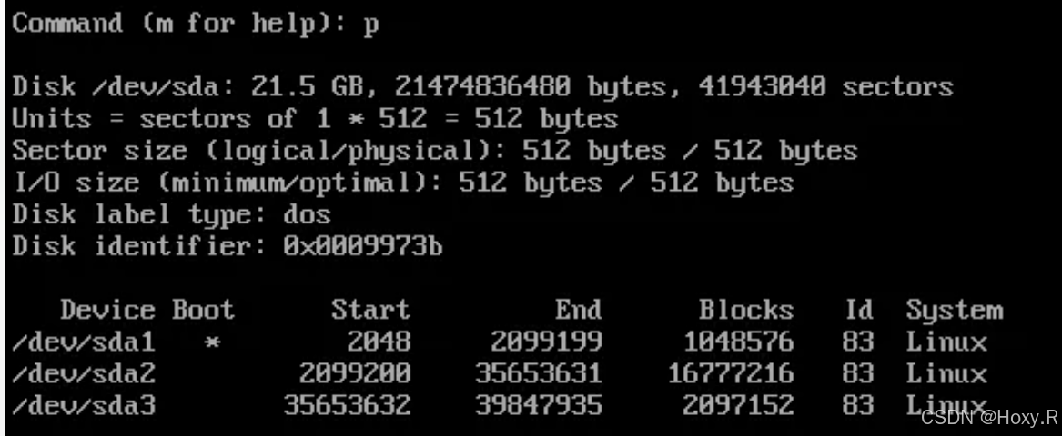 之后我们扩容的时候,sda2 的起始扇区必须保持 2099200 不变,如果起始位置不对则会数据全部丢失,2099200不能多也不能少。