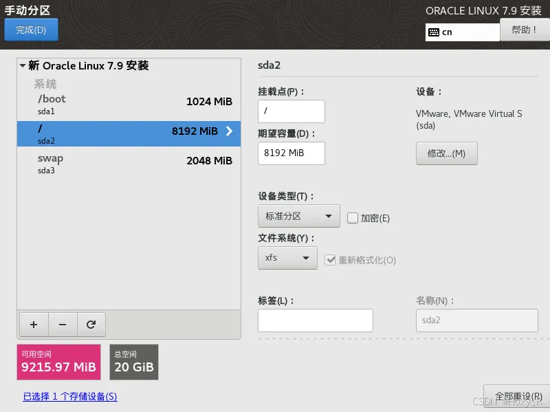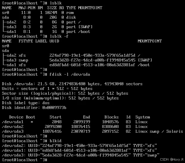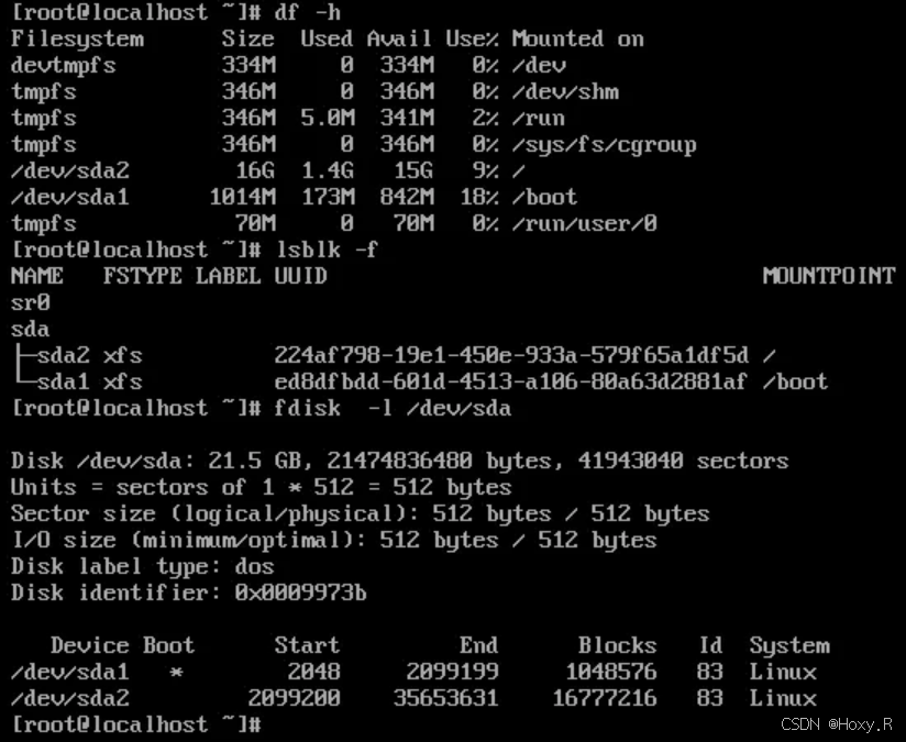 模拟环境:Oracle Linux 7.9,MBR 分区表(dos),根分区 / 使用 XFS,非 LVM,磁盘空间20G.
