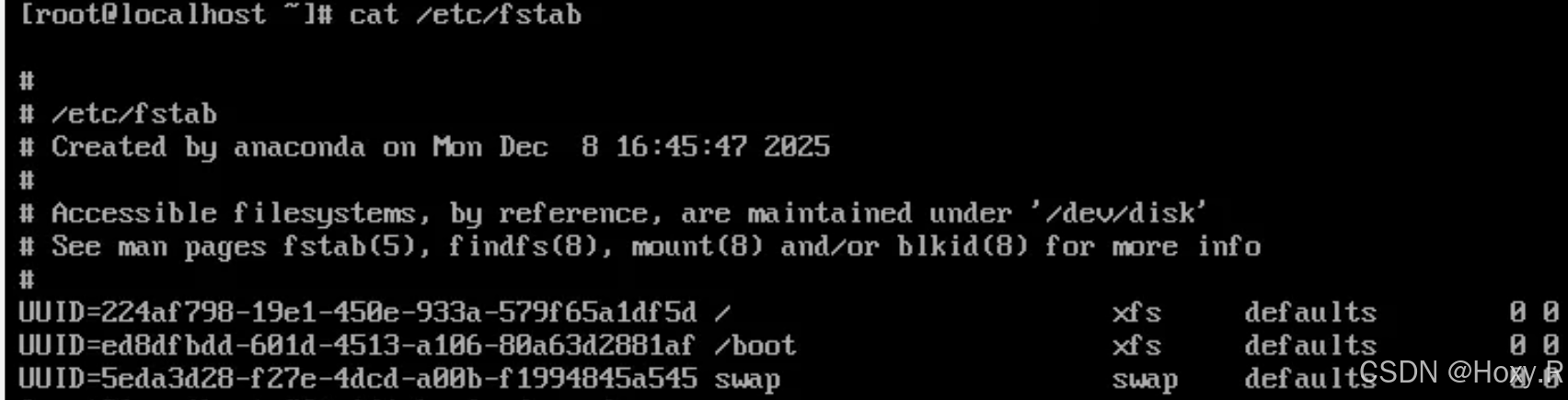 swap 这一行用的是旧的 UUID(5eda3d...),跟当前 blkid 查到的不一致。