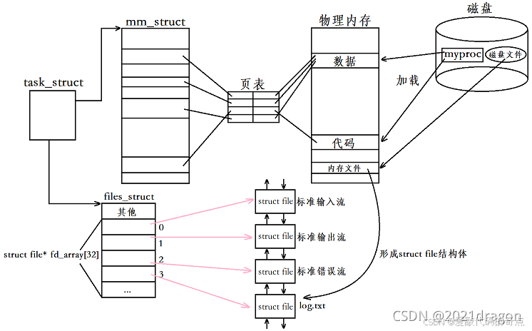 打开文件时,先把文件加载到内存,然后形成struct_file放入双链表里,把这个struct_file的地址填入fd_array下标为3的位置,最后返回文件描述符