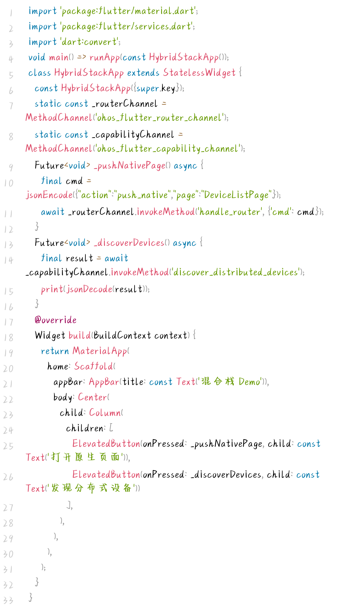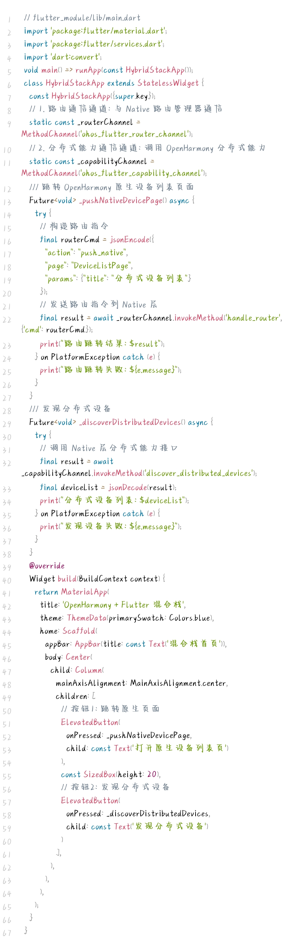 Flutter 层负责实现页面布局、路由指令发送与分布式能力调用,代码极简且聚焦业务逻辑,实现如下: