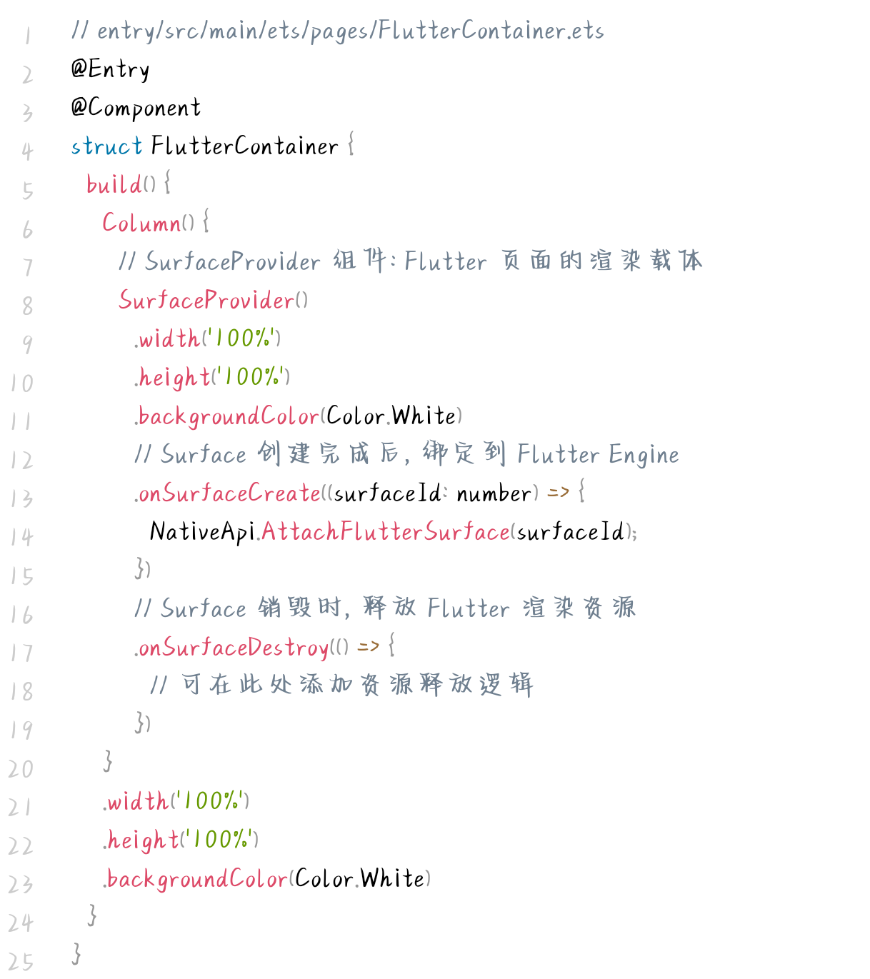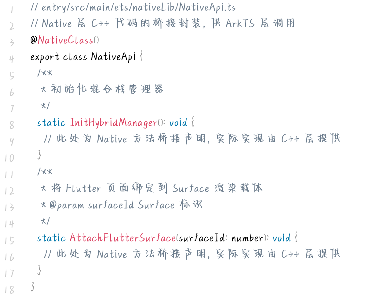 ArkTS 层负责提供 Flutter 页面的渲染载体,实现 Native 层 API 的桥接调用,并管理原生页面的路由逻辑,代码如下: