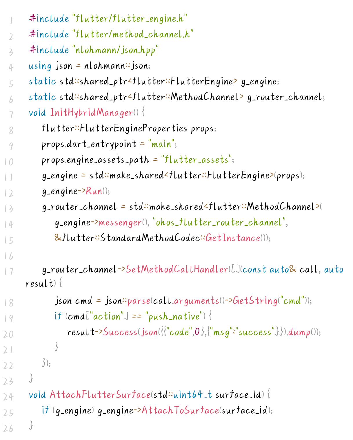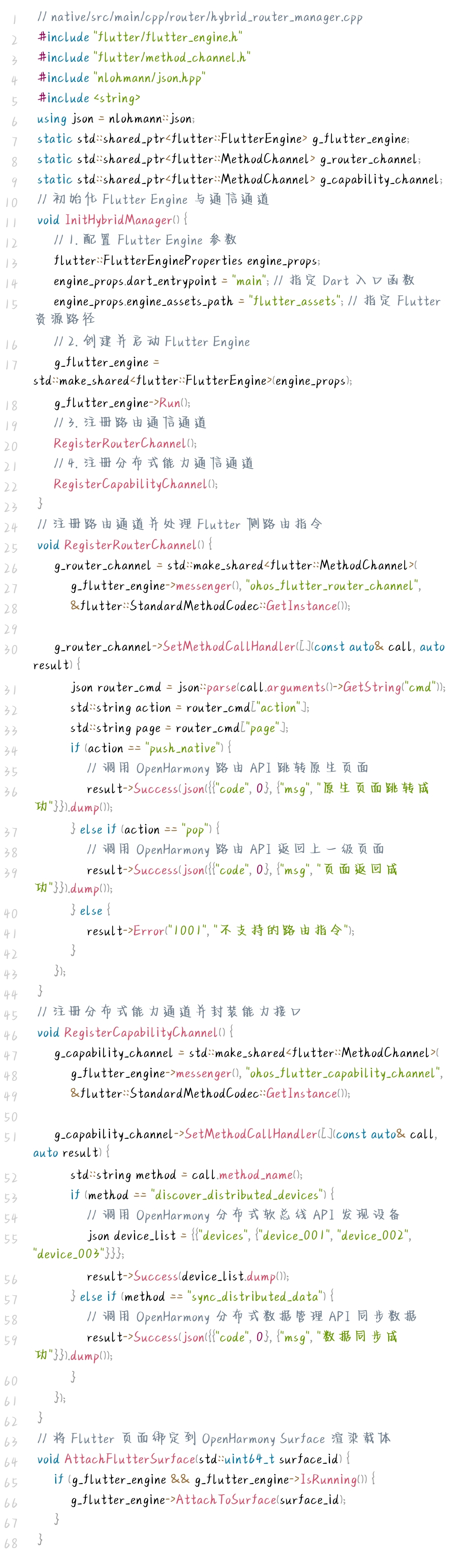 Native 层是混合栈架构的核心,负责 Flutter Engine 的管理、路由指令的处理与分布式能力的封装,代码聚焦核心逻辑,极简实现如下:
