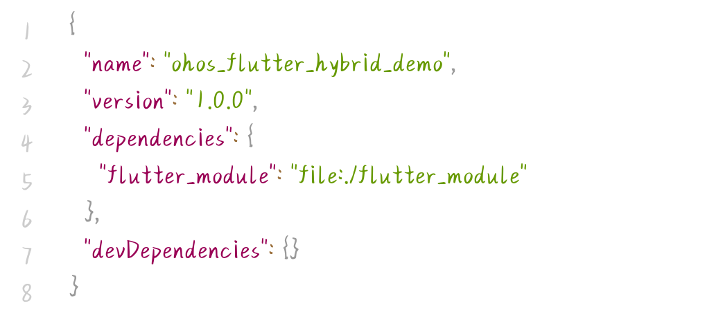 - 配置跨模块依赖:编辑 OpenHarmony 工程根目录下的 oh-package.json5 文件,添加 Flutter 模块的依赖声明,确保原生工程能够识别并加载 Flutter 模块: